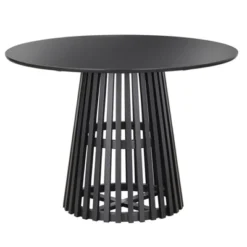 - Table features a slat-pedestal base constructed of solid rubberwood with a MDF veneer top