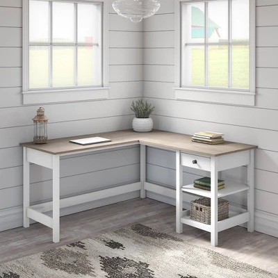 Stay on top of your daily tasks with a workspace that suits your casual home. Highlighted by its relaxed modern farmhouse style, the Bush Furniture Mayfield 60W L Shaped Computer Desk with Storage also includes plenty of practical features to keep you feeling productive. Spread out with all your materials on a durable 60W x 60D corner desk surface that supports a computer, books and more with a weight capacity of 200 pounds. Two shelves and a small box drawer on the right side of the L Desk ensure that the papers and office supplies you need are always within reach. The lower shelf is fixed for stability while the upper shelf can be raised or lowered to accommodate items of various sizes. Dark Bronze hardware complements the writing desk’s Pure White and Shiplap Gray two-tone finish for an easy going style you’re sure to love. Save space by placing the L Shaped Desk in a corner or make use of the fully finished back to take a prominent position in the middle of the room. Add the coordinating Mayfield Desktop Organizer (sold separately) to keep your home office or living room in order with eight cubby spaces, two pencil drawers and an accessory shelf for your phone or tablet. This farmhouse desk is tested to meet ANSI/SOHO quality standards for safety and performance and is backed by the Bush Furniture 1 Year Manufacturer’s Warranty. See the full collection for coordinating items available.