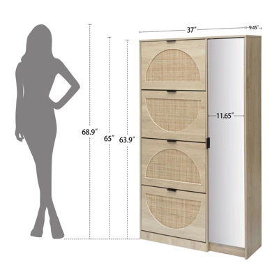Constructed from MDF and stainless steel, this displays natural finish that complements any color scheme. 4 Flip Down Drawers and 1 mirrors door carry with 4 Shelf to store up to 16 pairs of adult shoes.The shoe storage with 1 mirrors is perfect to organize and protect your shoes.its rectangular outline shoe cabinets for entryway slim space, livingroom and any casual space. Furniture Grade Materials – Antique shoe rack cabinet is made of environmentally friendly MDF (medium density fiberboard), rattan and metal, it has the characteristics of moisture absorption, heat absorption and natural ventilation,to make a sleek and antique in the home/office appearance.