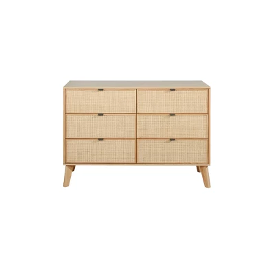 A new take on a classic midcentury modern look, this six-drawer dresser is a fresh addition to your bedroom. Clean design lines combined with woven rattan cane drawer fronts give a light, textural look with fresh organic allure. Accented by metal drawer pulls and solid wood legs, this dresser embodies casual elegance. Whether placed in a coastal retreat or a downtown loft, the generous size of this dresser will add much needed storage space to your home.
