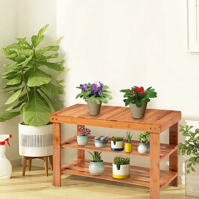 This is our new bamboo shoe rack bench, which is in high quality. And it is made of bamboo, which is environmentally friendly and durable. This shoe rack bench is really practical and useful. It can be used in many ways. You can sit on the bench not only when you are wearing your shoes. It has two shelves, on which many shoes can be put. This shoe rack bench is a good space organizer that can help you make your room become neater. So do not be hesitated! Come and buy one!