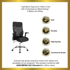 Enjoy all the comforts with this contemporary high back mesh office chair. A slim designer back paired with horizontal lines throughout the upholstery are truly captivating. The contoured backrest allows your back to rest comfortably, while the waterfall edge seat removes pressure from the lower legs and improves circulation. Chair rotates 360 degrees to provide easy access to a greater range of area. A pneumatic seat height adjustment lever lets you easily position the chair at a height that is most comfortable for you. The chrome base adds a stylish look to complement a contemporary office space. Look no further for a comfortable, breathable mesh office chair to bring your seating to new heights. Additional Features: Waterfall Seat reduces pressure on your legs, 360 Degree Swivel Seat, Padded Black Mesh Upholstered Seat with White Insert and CAL 117 Fire Retardant Foam, 5-Star Nylon Base with Silver Accents and Dual-Wheel Casters.