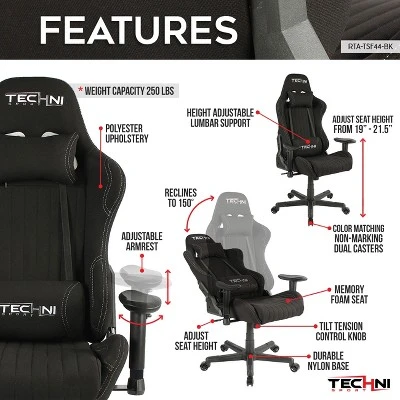 The Techni Sport TS-F44 Fabric Ergonomic Office High Back Computer Racing Gaming Chair will put the pedal to the metal on productivity in any office or game room. Unlike regular office chairs, it gives an eye catching racer style appearance and modern look to spruce up any environment. The cool resemblance of a sport’s car interior, will let your imagination “race” as you recline and swivel in superb comfort for gaming or work sessions lasting 8 hours or more. This ultimate computer gaming chair is made with synthetic TechniFlex fabric and features a height adjustable memory foam seat, reclining back mechanism up to 150 degrees, tilt & tension mechanism control, ergonomic and adjustable headrest and lumbar support cushions, height adjustable and swivel armrests, and a durable nylon base with non-marking 2″ casters. Seat adjusts from 17″ to 20.5″ high. 3% of sales go toward causes that fight against Alzheimer’s Disease. Weight Capacity: 250Lbs. Color: Black