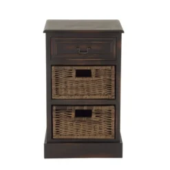 - •Wood accent table with drawers carries a dark brown finished with brown wicker baskets and antique gold hardware