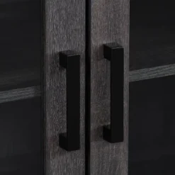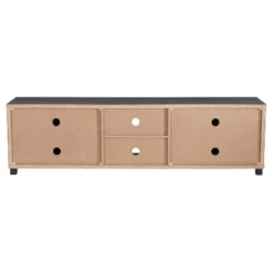 Elevate your entertaining space with this classic TV bench. A beautiful wood grain finish, this bench is designed to accommodate all your storage needs. With enclosed shelving areas on both ends and adjustable shelves to fit all of your A/V equipment, gaming console, and accessory heights. Sit back, relax and control all your equipment from the remote through the framed tempered safety glass doors. Keep your space tidy and organized with center open shelves and cable management openings in each storage area.