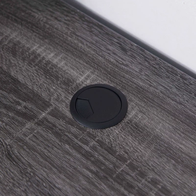 This transitional inspired L shaped desk contains 2-lockable drawers, one of which is for filing. It’s unique design also houses 2-open shelves and a cabinet with a frosted glass door. It comes equipped with 2-modern desk grommets for wire organizing, 1-built-in outlet and two USB ports. The toe kick bracket feet, trimmed knobs and beveled curve bar handle are finishing touches to the modern rustic desk. Choose between a Distressed gray or White Oak finish.