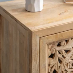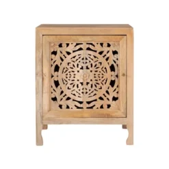 This single door cabinet features a beautiful medallion carved into the natural mango wood. The intricate design and rustic finish lend themselves to a boho aesthetic that interacts well with a variety of decor. Measuring at 28.5ā L x 19ā D x 34ā H, this compact piece fits seamlessly into tight spaces but can also stand on its own as a decorative feature. The top supports up to 200 lbs, while the shelf inside holds up to 60 lbs, making for a sturdy and stylish storage option you can count on.