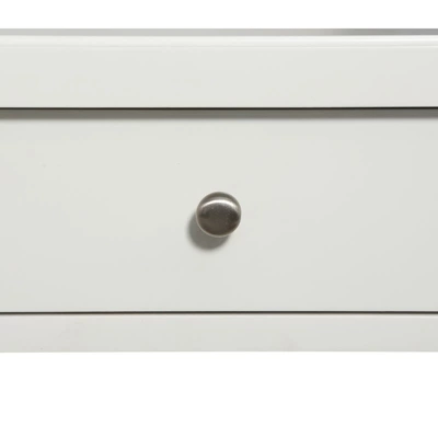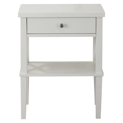 Keep it simple and stylish and with the Marta Nightstand. Features include solid wood construction with full extension side glides to maximize the space in the drawer. The open shelf is perfect for keeping reading materials handy or display.Features : Finish: WhiteFull extension metal side glidesHardwood solids and MDFOne drawer for storageHardware Finish: Brushed NickelOpen shelf for displaySpecifications : Target Audience : All AgesAssembly details : adult assembly required, tools not providedProduct Weight : 33 lbs.
