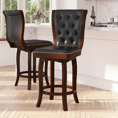 Sophistication and style abound in this wooden bar height stool with a beautiful cherry finish. Elegantly trimmed with a button tufted faux leather back and a nail trimmed swivel seat. An integrated footrest adds comfort while plastic floor glides protect your floors from damage. Add comfortable seating to your kitchen, dining room, man cave and more with this beautifully detailed stool. Additional Features: Protective Floor Glides, Item Size: 19.75″W x 26″D x 43.50″H – 19.75″W x 26.25″D x 47″H