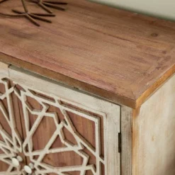 - This accent cabinet for home highlights a rectangular structure with rectangular doors accented with x-shaped metal designs and curved handles