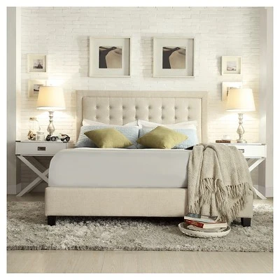A traditional look with a contemporary twist, the Hudoson Button Tufted Bed from Inspire Q is a gorgeous addition to your bedroom décor. The soft linen fabric is the perfect neutral backdrop for any décor theme. The button-tufted headboard features solid uphosltered framing that adds a unique touch, while fully uphosltered rails bring a cohesive look. Mattress and box spring required for use, but not included.