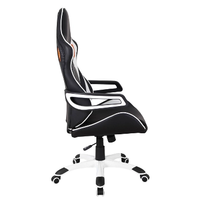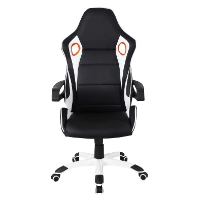 Get into the action with this streamlined professional Techni Mobili Racing Style Home & Office Chair. Built to emulate an ergonomic style, made with rich PU and segment padding provides lasting lumbar support to help you to focus into your work for longer hours. The tilt mechanism with tension control, pneumatic seat height adjustment with the practical swivel let you customize your work setup with maximum comfort. The durable and easy-to-clean surface features a striking black and white color scheme adding a dynamic look with fixed contoured armrests. The non-marking casters and durable 5-star nylon base ensures that your office chair work with you. It comes with 2-year limited warranty and weight support up to 200 lbs.