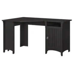 The Bush Furniture Salinas 55W Corner Desk with Storage combines casual style and a practical, space-saving design that makes it a perfect choice for your small home office. Tackle your next project or assignment on the 55 inch desk surface while keeping essential work materials organized inside the attached storage cabinet. The cabinet can be placed on either side to form a right or left handed configuration and contains one adjustable shelf to accommodate items of various sizes. Use the open cubby space to keep writing utensils, notepads and work-in-progress easily accessible when you need them. Inspired by timeless mission style, this 55W x 36D x 30H small computer desk features tapered legs, curved base rails and decorative wood accents that blend seamlessly with farmhouse and cottage decor. Find the perfect look for your casual home with attractive Antique White, Cape Cod Gray and Vintage Black finishes complemented by Tumbled Pewter hardware. Quality construction withstands years of use in virtually any living space with a surface weight capacity of 200 pounds. This L Shaped Desk with Storage is tested to meet ANSI/SOHO quality standards for safety and performance and is backed by the Bush Furniture 1 Year Manufacturer’s Warranty. See the full Salinas Collection for coordinating items to expand your workspace with the same relaxed charm.