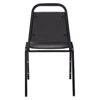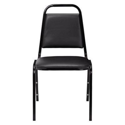Fine seating at a fantastic price when you add the 9100 Series upholstered Value Stacker to any venue. This affordable stack chair brandishes a 1.5 -thick, pullover-style, foam-padded cushion covered with thick easy-to-clean vinyl. Plywood core within both the seat and tapered backrest which features a built-in handle for easy moving and stacking. A mighty 19-gauge square tubular steel frame includes under-seat bars to provide excellent support along with plastic glides to avoid marring floor surfaces. Safely stack up to 10 chairs, each with eight plastic bumpers attached to protect its attractive black powder-coated paint finish from scratching.