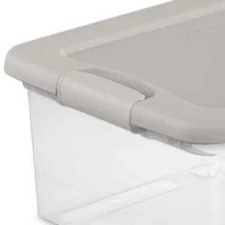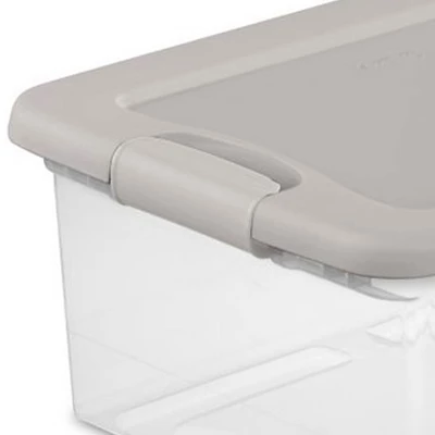 Maintain order and cleanliness in your household with this 12-pack of 15-Quart Clear Latching Storage Box from Sterilite, the perfect storage solution for your household needs.Step up to these plastic organizer boxes, featuring a modern space-saving shape and an innovative hinging lid. Simply undo 1 latch and lift the lid for easy access, all with 1 hand. The other latch stays attached and acts as a hinge, even when the lid is opened all the way. These organizer bins are ideal for storing shoes, toys, crafts, and other small items around the home and fit conveniently on 16-inch wire closet shelving.The recessed lid allows same-size storage boxes to stack neatly on top of each other to use vertical storage space efficiently. The overall assembled dimensions of these items are 16.25 inches long, 11.25 inches wide, and 6.75 inches tall.Clear some clutter from your life and tuck away your belongings with the 12-pack of 15-Quart Clear Latching Storage Box from Sterilite.
