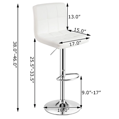 This is our brand new round bar stool, made of high-quality steel frames and water-proof PU leather, sturdy and durable. Its white quadrate cushion which filled with high density stereotypes sponges provides maximum comfort for you.Its simple but elegant design makes it perfect for home, bar,restaurant, company etc. The height of the seat can be adjusted from 24.5″ to 32.5″ to well meet your needs. Moreover,it can rotate 360 degrees, very convenient! The curved backrest can support your waist when you sit on the stool. Worth having!