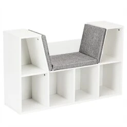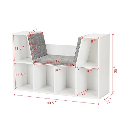 - 【6-cubby Kid Bookcase with Seat Cushion】This Wooden Corner Storage Shelf Book Nook has heaps of storage for your little one’s belongings. Featuring six open-front storage cubbies, your child can place their favorite stories books, magazines, keepsakes, toys, and more. It can also fit easily against the wall in any room to save some space.