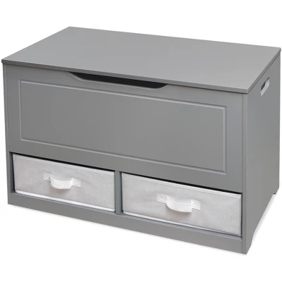 Badger Basket’s multitalented Up and Down Toy Box handles larger toys in the spacious top bin and small items like doll clothes and building bricks in the two baskets below. No more little, lost pieces at the bottom of the toy chest! Smart design tidies up, sorts, and organizes messy clutter and functions as a kid’s bench. Make room for this versatile storage box in your child’s bedroom, or the playroom, family room, or den. Makes a perfect dress-up clothes chest! Quality hardware with safety support hinge that holds the lid open. Handle opening on the front under the lid is a convenient way to lift up the top, and prevent injury when shutting it. Reverse the two-color baskets to customize the look! You may choose not to use the baskets and instead have open cubbies, perfect for books, games, and puzzles. The Up and Down Toy Box is just the right height for kids to easily access their toys, and it’s conveniently down at their level so they can efficiently clean up. Lid opens to full vertical allowing easy access to the 2.75 cubic feet of space inside. Made with engineered wood, fabric, and non-woven fabric. Overall measurements 31.5 inches L x 15.75 inches W x 19 inches H (32.5 inches H with lid fully open). Interior space dimensions: 30.25 inches L x 14.25 inches W x 11 inches H. Baskets (each): 14.5 inches L x 14 inches W x 4.5 inches H. Assembled weight: 39 pounds. All measurements approximate. Wipe and spot clean. Adult assembly required. Product complies with all currently applicable safety standards. Bench supports up to 175 pounds. Product may vary slightly from shown. Props/accessories shown are for illustration purposes only. Product complies with all currently applicable safety standards. Actual color/finish may vary from screen display. This item ships in its original carton that may include a product photo. Soft plastic/rubber toys (such as balls) can react with the finish when left in prolonged contact. Be mindful of what is stored in the unit.