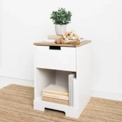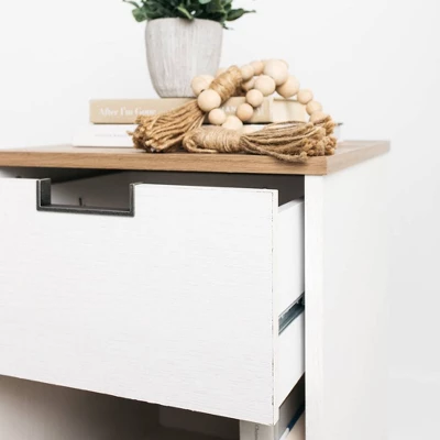 Fresh and inviting, this 1-drawer nightstand is truly versatile. A crisp white painted finish brings light to your room, while a warm brown finish accents the top. The top drawer is accented with a metal detailed opening, and an open cubby offers additional storage space. A smooth-gliding drawer with vinyl-wrapped sides and back for durability makes this nightstand a lively addition that will brighten your space in a snap. Signature Design by Ashley is a registered trademark of Ashley Furniture Industries, Inc.