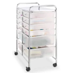 Whitmor’s 12-drawer plastic drawer storage cart is perfect for the home, classroom, or art studio. This organizer features 12 easy-access drawers. It is great for paper, tools, accessories, crafting, scrapbooking, school or home office supplies. The cart includes 8 small (15.25″ x 11.25″ x 2.8″) and 4 large (15.25″ x 11.25″ x 5.25″) drawers. The chrome top to this storage cart can be used as an extra workspace. The heavy-duty casters make this storage cart easy to put away when not in use. Easy to care for, just wipe with a clean damp cloth to keep it looking as good as new for years to come. The sturdy metal frame is easy to assemble, all you need is a Phillips screwdriver. Assembled Dimensions: 15.35 L x 24.80 W x 31.88 H inches. Whitmor is a 4th generation family-owned and operated business. Since 1946, Whitmor has been dedicated to bringing organization home by creating products that simplify everyday life. Ensuring that those products are built with integrity, value, and innovation is our commitment to you. And our promise is that we will always be here for you should you ever need us as we stand behind our product 100%. Whitmor customer service is available in English and Spanish Monday through Friday from 8 am – 4:30 pm CST. Call us and we will gladly assist you in your language. You may contact Whitmor toll-free at 1-888-944-8667 or via email at [email protected].