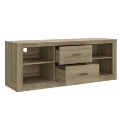 Designed with perfection, this clean lined TV Stand is sure to accentuate the aesthetics of your interior and at the same time will provide sophisticated abode to all your media gadgets. Incorporated with 2 smooth gliding drawers and 4 open compartments for your media necessities, the structure rests on a stable base. Constructed from the CARB certified wood product to ensure stable equilibrium with nature and health, the oak brown accent is an add on to its look. The bar pulls facilitate easy access to the storage space. Equipped with a stout appeal, which adds to the sturdiness of the TV Stand, the transitional style inspired TV Stand readily assimilates with a variety of decor settings.