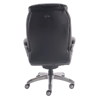Find a reason to relax during your workday with this Executive Office Chair from Serta, a brand known for quality and comfort. This ergonomic desk chair has layered body pillows and a pillowed headrest to provide ease while seated for long periods of time. The hand-sculpted arms and smooth bonded leather upholstery have a sleek, professional look that stands out in any work environment. Fully adjustable, this executive office chair allows the user to customize the height and lumbar zone for optimal comfort. This desk chair has a five-layer cushioning system for all day comfort and support.
