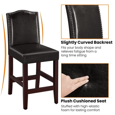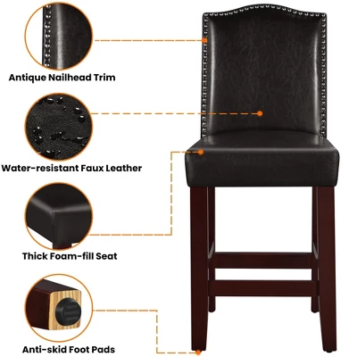 - This set of kitchen stools is built of solid wood and engineered wood frame and well stuffed with thick high-density foam for a comfortable sitting experience. The high backrest and footrest add extra stability and make you feel at ease when sitting. The slightly arched top and silver-colored nailhead trim on the edge bring a classic look to your home. While simple lines combined with armless design create a sleek and modern feel. Fit for most home decors. This pair of counter stools is perfect for kitchens, dining rooms, home bars, restaurants, cafe and more.