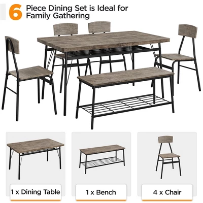 - 【6-Piece Dining Set】Our dining room set includes a spacious dining table, 4 chairs and a long bench, which allows up to 6 people to dine, drink or have fun together. A trendy farmhouse style combined with practical use makes this set perfect to accompany all memorable occasions of you and your family&friends.